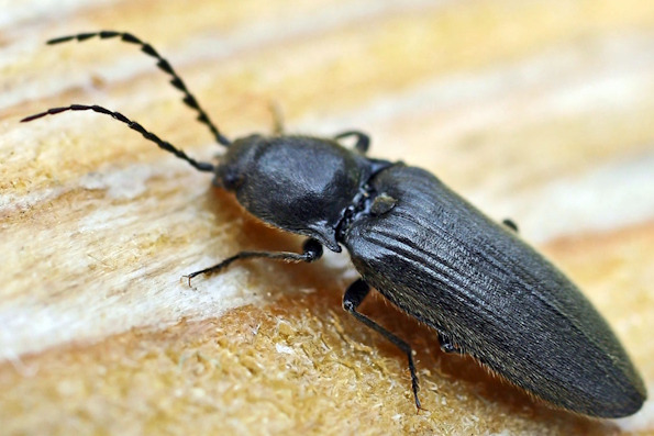Жук-щелкун – небольшое насекомое размером 1–2 см. Название связано со щелчком, с которым оно переворачивается, оказавшись на спине. Эти жуки на стадии имаго питаются листьями и пыльцой, не причиняя особого вреда культурным растениям. Эта стадия продолжается не более месяц, но самка успевает отложить до нескольких сотен яиц.